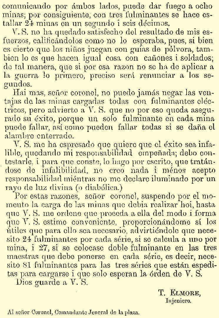 Se conoce que en el último mes Bolognesi estaba insatisfecho con trabajos de minado. Elmore respondió con insolente oficio.