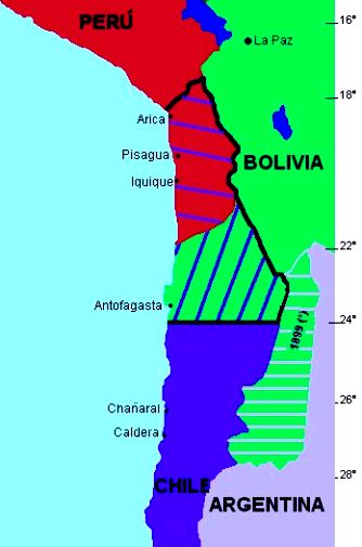 | En rayas diagonales, territorio robado por Chile a Bolivia (verde) y al Perú (rojo). |