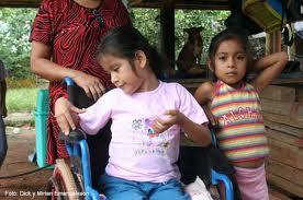 Otra niña con discapacidad severa está sentada en una silla de ruedas, se llama Luisa y la discapacidad también afectó su cerebro.