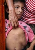 LAGO AGRIO / AMAZONAS / Cuando ANTONY nació era sólo como un cascarón de huevo, delgadito y tan frágil, dice su tía y levanta los brazos del muchachito que sonríe alegre por tener una visita inesperada en su casa humilde. Los brazos del niño son deformados y sin fuerza. Las piernas son aún más deformadas y no le permitirán jugar ni desplazarse libremente por la vida.