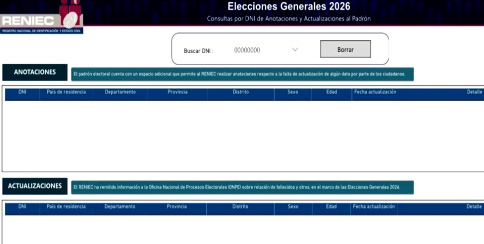 Con el objetivo de fortalecer el acceso a información oficial sobre el proceso electoral, Reniec puso a disposición de miembros de mesa, personeros y ciudadanía en general una plataforma virtual que permite realizar consultas en el padrón electoral de las EG 2026. A través de esta herramienta digital, los usuarios pueden ingresar su número de DNI o el documento a verificar para conocer si figuran alguna nota en el apartado de Anotaciones al Padrón o en las listas de actualizaciones remitidas a la Oficina Nacional de Procesos Electorales (ONPE).