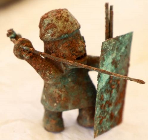 Asimismo, a una profundidad mayor se halló una ofrenda ceremonial de forma circular, en cuya parte central estaba clavada una barreta. Una lámina metálica de 73 centímetros de longitud y 18 centímetros de altura, dividía la ofrenda. Alrededor de la barreta se descubrió 6 ídolos pequeños, separados en dos grupos, de los cuales dos son personajes zoomorfos, dos guerreros y dos pumas, elaborados en una aleación de cobre plateado mediante la técnica de vaciado. Uno de los guerreros lleva en la mano una cachiporra mientras que el otro tiene una lanza en la mano derecha y un escudo en la mano izquierda.