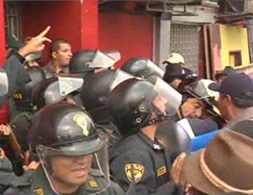 Cuando la policía intentó cumplir la orden judicial, los aimaras protestaron en la zona exterior del canal coreando lemas contra el presidente Alan García, a quien acusaban de vendepatria.