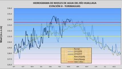 El SENAMHI informa que, como consecuencia de las persistentes lluvias en la Cuenca Amazónica, el río Huallaga ha incrementado significativamente su nivel, y se mantiene en su nivel crítico de inundación en la ciudad de Yurimaguas (provincia de Alto Amazonas, Loreto).