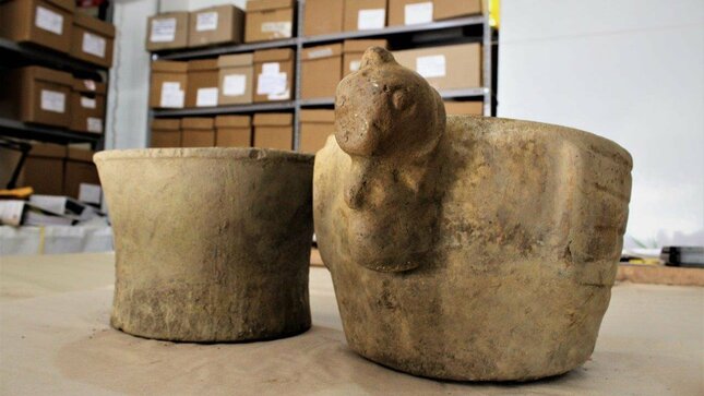 También se halló una vasija de piedra sencilla, con el borde refinado. Ambas piezas tienen una medición de 30 cm. de diámetro por 25 cm. de altura.