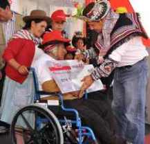 Luego el presidente Ollanta Humala entregó simbólicamente a la señora Aniceta De la Cruz (78) su tarjeta que la acredita como la primera beneficiaria del programa “Pensión 65”. En tanto, la segunda beneficiaria es la señora Fortunata Clemente (75), quien pese a una discapacidad física para trasladarse acudió al encuentro con el mandatario en una silla de ruedas.