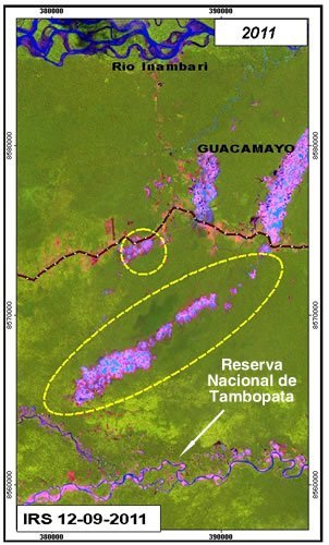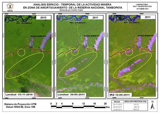 De acuerdo a esta información, entre noviembre del 2010 y octubre de este año, la zona deforestada por la minería aumentó de 100 a 1583 hectáreas. En esta imagen se evidencia, además, que el radio de acción de los mineros ha llegado a la misma Reserva Nacional de Tambopata, y no sólo a su zona de amortiguamiento.