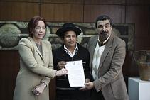 El viceministro de Patrimonio Cultural e Industrias Culturales y Artes, Javier Luna, junto a la Directora General de Patrimonio Cultural, Paloma Carcedo, entregaron esta mañana la resolución que hace posible la construcción de la carretera Aiza – Tupe, al alcalde del distrito de Tupe, Benjamín Ordoñez Payano.