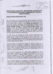La bancada nacionalista del Congreso de la República presentó este viernes 15 de junio un proyecto de Resolución Legislativa pidiendo la nulidad del total del proceso electoral que dio como resultado la cuestionada elección de los nuevos magistrados del Tribunal Constitucional (TC)l, por considerarla viciada debido a su falta de transparencia y manchada por la infeliz actuación del Dr. Javier Ríos, quien en la víspera de su elección fue sorprendido en una reunión con la mafia montesinista.