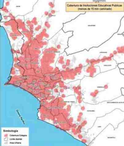Horna señaló que el estudio indica un hallazgo interesante “Al georeferenciar los 8 047 instituciones educativas de primaria y secundaria, y verificarlas con todos los comercios y puntos de interés que tenemos ya mapeados en Lima Metropolitana, se identificó que en los distritos de Lima Norte y Este, si una persona va a pié a cualquier punto, durante 15 minutos, tiene más probabilidades de encontrar un colegio, público o privado, que un banco o una comisaría”.