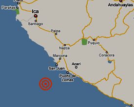 El epicentro del temblor, ocurrido a las 18:25 horas, se ubicó en el océano, 46 kilómetros al sureste de San Juan de Marcona, departamento de Ica, con hipocentro a 36 kilómetros de profundidad, según informa el Instituto Geofísico del Perú.