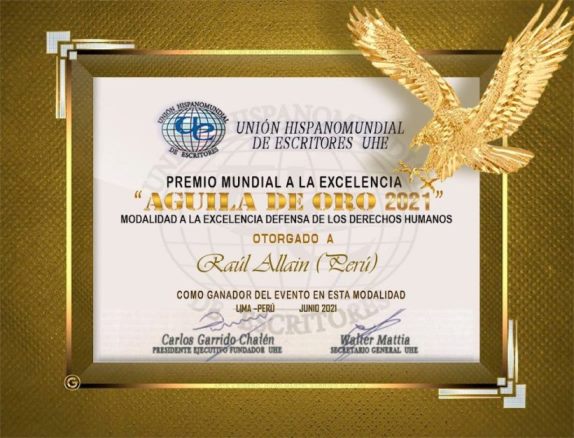 El sociólogo Raúl Allain recibió el Premio Mundial a la Excelencia “El Águila de Oro” en la modalidad de Defensa de los Derechos Humanos. Este galardón es otorgado por la Unión Hispanomundial de Escritores (UHE) que preside Carlos Garrido Chalén, reconocido escritor y abogado.