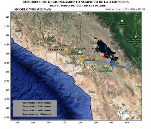 El Servicio Nacional de Meteorología e Hidrología del Perú – SENAMHI, organismo adscrito al Ministerio del Ambiente, informa que para los próximos días predominarán vientos con dirección hacia el sureste que favorecerán la dispersión de cenizas expulsadas por el volcán Ubinas hacia el norte de Moquegua y sur de Puno.