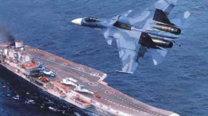 Un caza ruso Su-33 sobrevuela el portaaviones Almirante Kuznetsov.