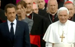 | Sarkozy, Benedicto XVI y Bruni (atrás) durante vivista del Papa en París. |