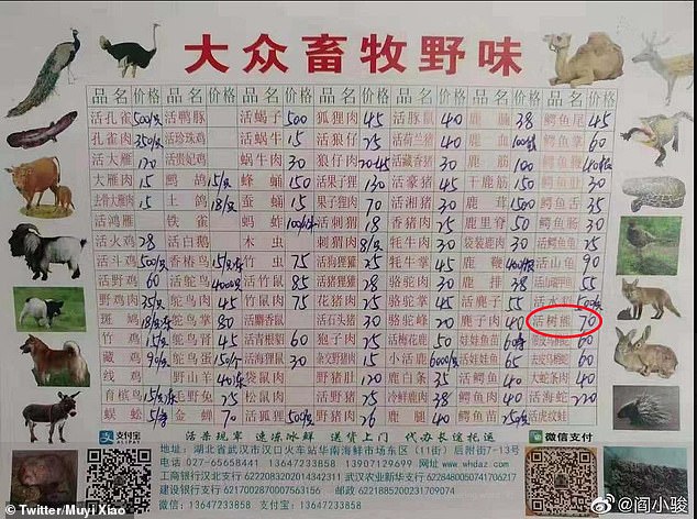 Una lista de precios para una de las empresas que operan en el mercado mostró una colección de animales disponibles para la venta, incluidos zorros vivos, cocodrilos, cachorros de lobo, salamandras gigantes, serpientes, ratas, pavos reales, puercoespines, koalas y carnes de caza, según el Sur China Morning Post.