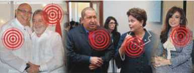Les comparto además sobre este tema, el trabajo de mi querido hermano Miguel, a cuyo texto pertenece la foto que encabeza este post, donde aparecen Fernando Lugo, Lula da Silva, Hugo Chávez, Dilma Rouseff y Cristina Fernández, “casualmente” los mandatarios progresistas aquejados por la fatal enfermedad, más o menos en el mismo período: