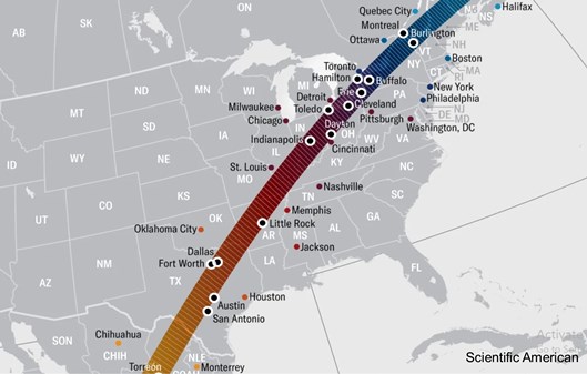 En los Estados Unidos los estados que verán eclipse total son Arkansas, Illinois, Indiana, Kentucky, Maine, Michigan, Missoure, New Hampshire, New York, Ohio, Oklahoma, Pennsylvania, Tennessee, Texas y Vermont.