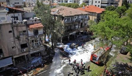 Fuerzas y servicios de emergencia de Israel trabajan en escena de un ataque con cohete en Ramat Gan cerca de Tel Aviv, 15 de mayo de 2021. (Foto: AFP)