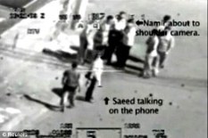 El helicóptero da varias vueltas alrededor de la zona, con la mira apuntando directo hacia el centro del grupo de aproximadamente ocho hombres. WikiLeaks y su socio en la divulgación de esta noticia, el Servicio Nacional de Radiodifusión Islandés, subtituló el video y agregó flechas señalando a los empleados de Reuters.