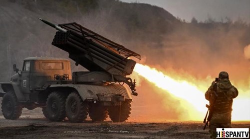 Los militares rusos disparan un lanzacohetes múltiple BM-21 Grad hacia posiciones ucranianas en el sector Krasnyi Lyman, 15 de febrero de 2024