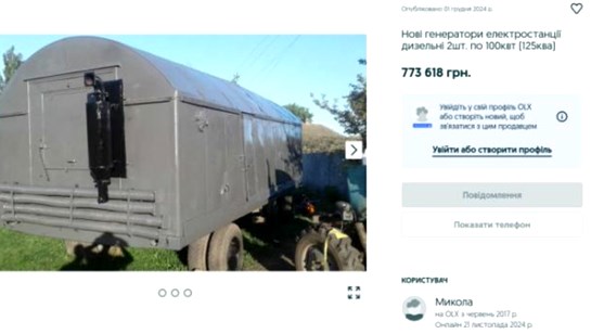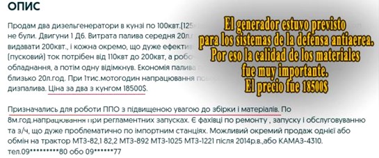 Supongamos que ahora la sociedad ucraniana está dedicada a la guerra contra Rusia, el proceso de instrucción escolar y el tratamiento de los enfermos se fueron por el camino. Pero este sitio-web tiene el anuncio sobre la venta del generador nuevo a escala industrial a 200 kw, que se destinaba para el funcionamiento continuo del sistema de la defensa antiaérea. Se vende aproximadamente por 18.5 millones de dólares.