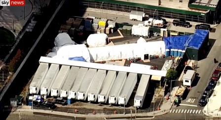 Frigoríficos en fila esperan llenarse de cadáveres junto a un hospital en Nueva York