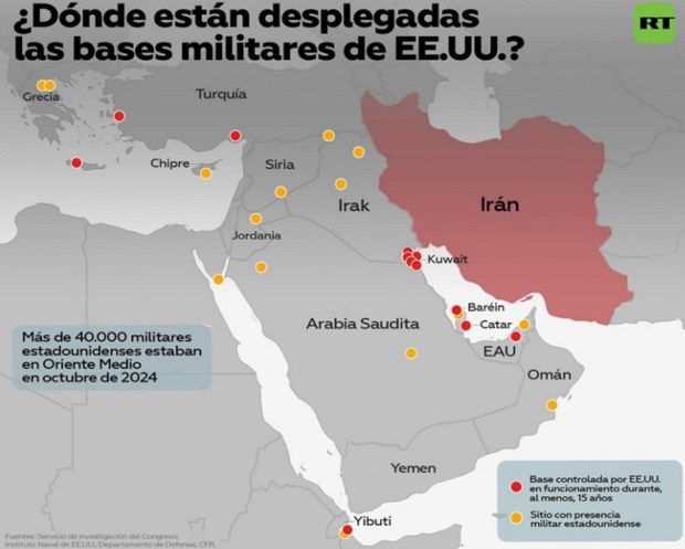 Estados Unidos opera una red de unas 20 bases militares permanentes y temporales en Oriente Medio. La mayor, Al Udeid (Catar), alberga a 10.000 efectivos y funciona como cuartel general avanzado de CENTCOM.