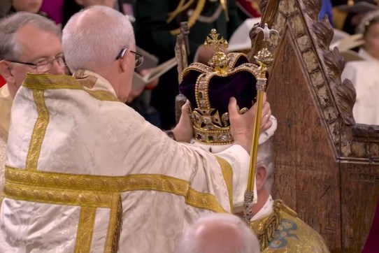 Al momento del reconocimiento, a los asistentes de la ceremonia se les preguntó si reconocen a Carlos III como su rey, a lo que respondieron “Dios salve al rey”. Carlos III juró respetar la ley y la Iglesia de Inglaterra y se sentó en la Silla de la Coronación para la unción, que fue privada, para lo cual bloquearon la vista al público con unas mamparas.