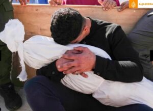 Palestino abraza el cuerpo de su hijo de cinco años, que murió en un ataque aéreo israelí nocturno contra una escuela utilizada como refugio [Abdel Kareem Hana/Foto AP]