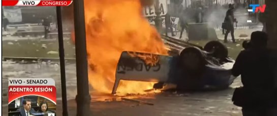 Incendio de un vehículo durante las protestas contra la aprobación de la ley hoy