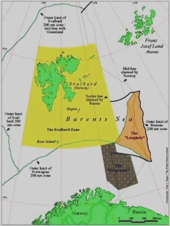 En el círculo polar ártico está el archipiélago de Svalbard (o Spitsbergen), que pertenece en su mayor parte a Noruega, y en menor proporción a la Federación Rusa, según un tratado de 1920. En lo concerniente a la coexistencia en tierra, todo está en armonía; incluso hay polacos por ahí. El origen de la disputa es la zona pesquera adyacente, respecto de la cual no hay acuerdos claros, no se tiene una delimitación que sea unánimemente reconocida por noruegos y rusos.