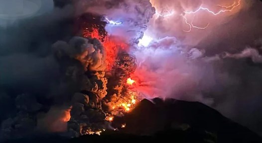 Imágenes compartidas por la agencia de mitigación de desastres de Indonesia mostraron relámpagos sobre el cráter de Ruang, mientras ardientes nubes rojas de lava y rocas se proyectaban en el aire y llovían alrededor de la isla.