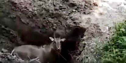 Solo la cabeza del antílope se asoma del suelo antes de que los cazadores finalmente la cubran por completo.