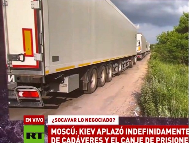 Filas de camiones frigoríficos rusos conteniendo cadáveres de militares ucranianos esperan en vano el recojo por parte de Ucrania. Entre los cuerpos abandonados por Zelensky podría estar el del peruano José Ávila Tuanama.