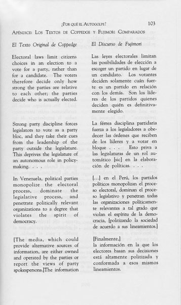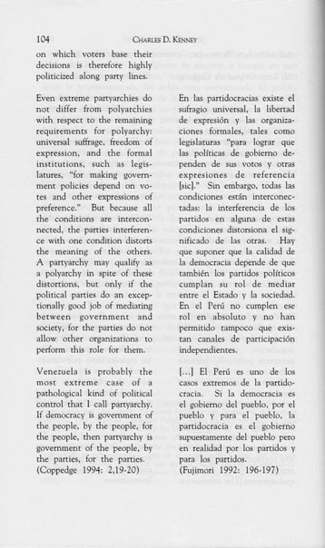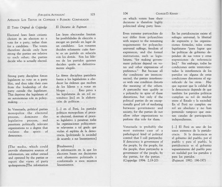 En la parte final del capítulo de Charles D. Kenney: “¿Por qué el autogolpe?”, el autor reveló que las largas justificaciones del golpe como una acción contra la partidocracia, “no fueron escritas originalmente por Fujimori y sus asesores para hablar del Perú en 1992, sino que fueron publicadas en 1988 por un autor norteamericano, Michael Coppedge, en su disertación doctoral sobre Venezuela”.