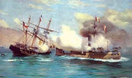 Llegada a remolque de la Cañonera Covadonga por el tranporte Armado Loa, después del Combate de Punta Gruesa con la Fragata Blindada Independencia.Las dos naves en la foto luego serian hundidas por los peruanos por acciones torpederas, la Covadonga en Chancay y el Loa frente al al desembocadura del Río Chillón,durante la guerra el Perú pudo hundir 6 barcos chilenos.
