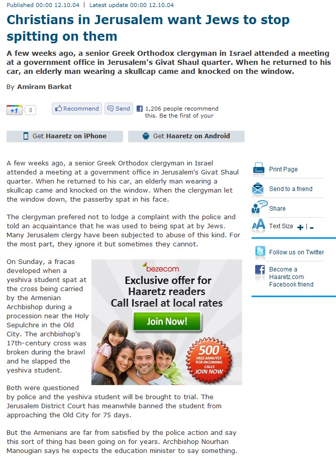 (1) “Christians in Jerusalem want Jews to stop spitting on them”, publicado en Haaretz, 12 de octubre de 2004. Para leer el artículo en idioma inglés haga clic en: http://www.haaretz.com/hasen/pages/ShArt.jhtml?itemNo=487412&contrassID=2&subContrassID=5&sbSubContrassID=0&listSrc=Y&itemNo=487412
